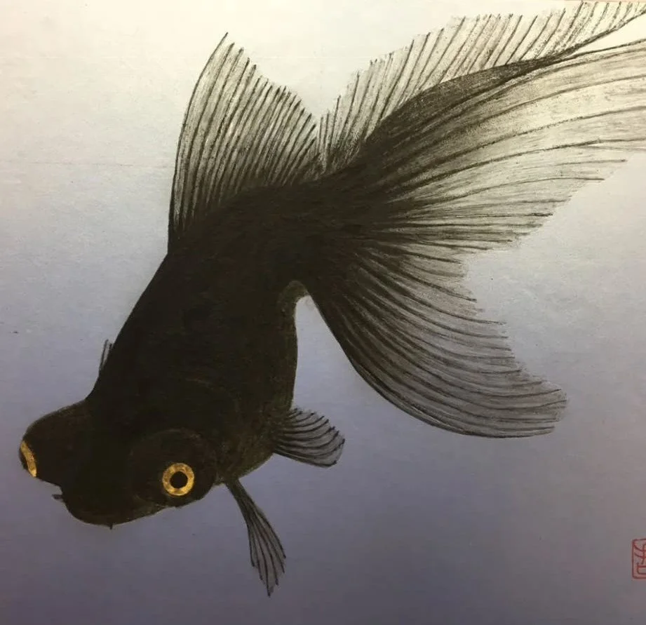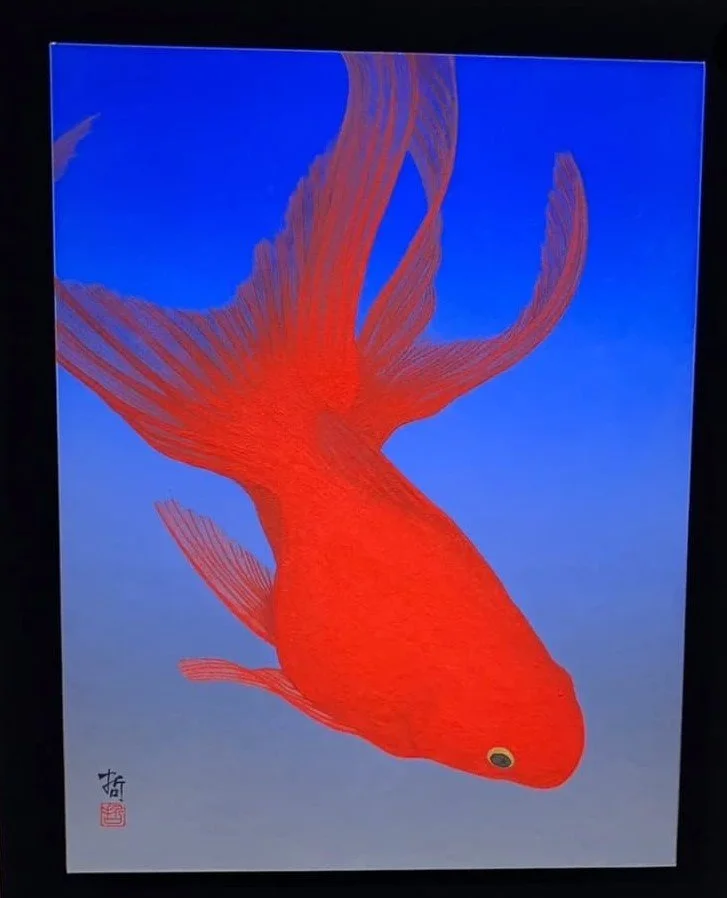 Tetsuei is renowned for his ethereal and intricately detailed paintings of goldfish. His work captures the ephemeral beauty of these creatures in a manner that is both meditative and mesmerizing. These goldfish—rendered in layers of luminous pigment—seem to exist in a liminal space between realism and dreamlike abstraction. Each brushstroke, executed with exquisite precision, conveys the weightlessness of the fish as they drift through their aqueous realms. Their scales shimmer with an almost otherworldly glow, a testament to the artist’s mastery of color and texture.