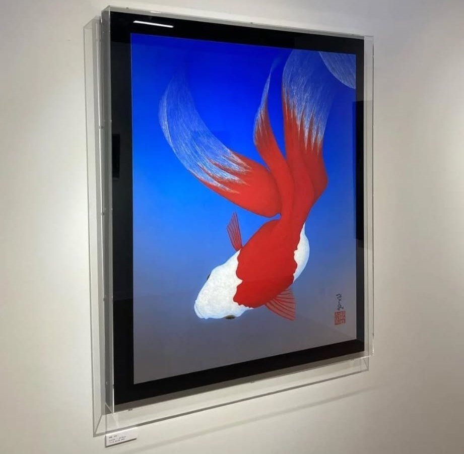哲瑛さんは、幻想的で精緻な金魚の絵画で広く知られています。彼の作品は、金魚の儚き美を、瞑想的でありながらも魅惑的な筆致で捉えています。幾重にも重ねられた透明感あふれる顔料によって描かれた金魚たちは、写実と夢幻の狭間に漂うような存在感を放ちます。ひと筆ひと筆に込められた繊細な技が、水の中をたゆたう金魚の無重力感を見事に表現し、その鱗は異世界のような輝きをたたえています。色彩と質感を操る哲瑛さんの卓越した技術が、そこに息づいているのです。